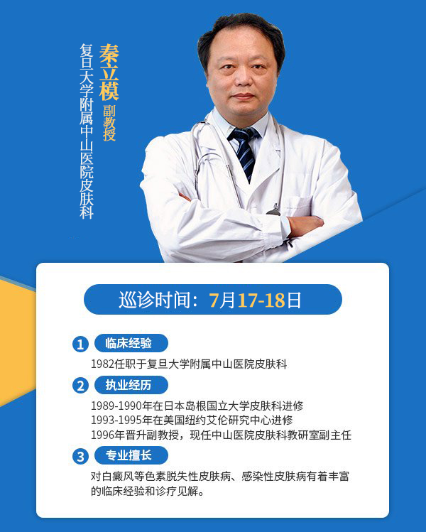夏季不仅是白癜风高发季,也是复色理想季!夏天气温相对较高,人体血液循环较快,此时治疗对白癜风复色有利。为了帮助广大白癜风学子抓住夏季祛白的良好时机,赣州中研白癜风研究院特于7月17-18日邀请复旦大学附属中山医院皮肤科副教授-秦立模来院巡诊,另有6重专项帮扶,助力今夏复色。