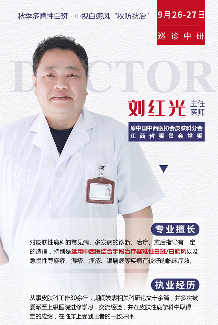 为了帮助更多患者成功祛白,值此初秋祛白好时机,赣州中研白癜风研究院特于9月26日-27日邀请白癜风专家刘红光教授开展秋季白斑公益普查活动,旨在倡导科学的诊疗模式,帮助更多患者树立治疗的信心、决心,使白癜风患者在好时机祛白,早日摆脱疾病困扰,传递爱的接力。