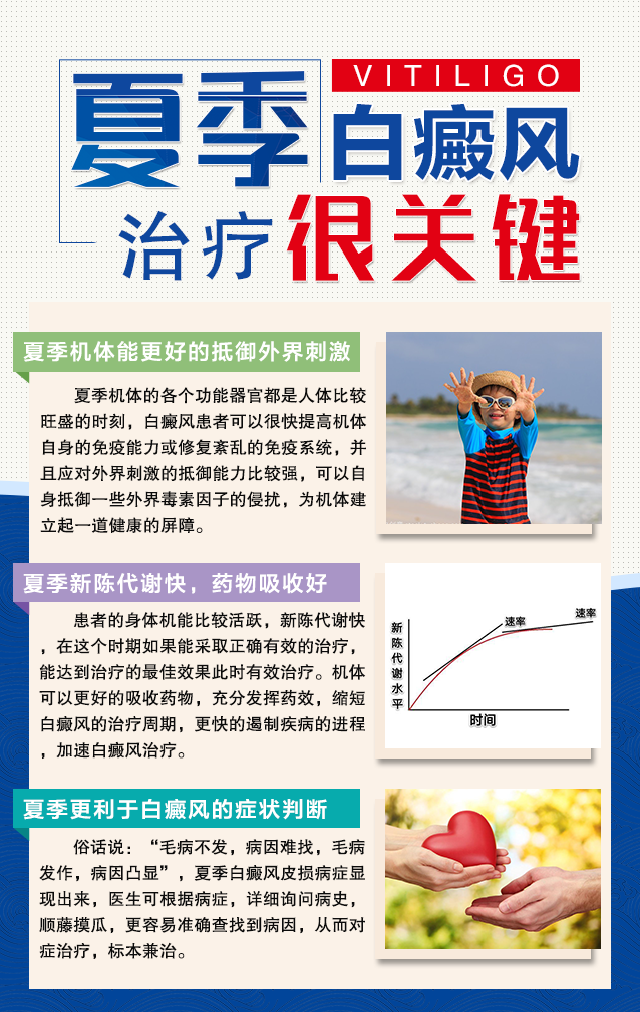 时间已过芒种,进入夏季以后所有白癜风患者都需要引起重视;夏季患者的身体机能比较活跃,新陈代谢快,在这个时期如果能采取正确有效的治疗,能达到治疗的最佳效果此时有效治疗。机体可以更好的吸收药物,充分发挥药效,缩短白癜风的治疗周期,更快的遏制疾病的进程,加速白癜风治疗。
