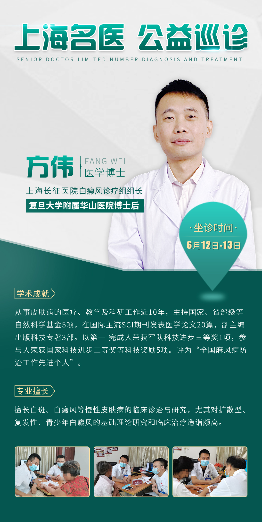 端午不放假,假期内专家正常接诊。为帮助更多白癜风患者得到专业、规范的治疗,6月12日—14日,我院特开展【端午长假“粽”情祛白】活动,届时特邀上海长征医院(海军军医大学第二附属医院)方伟医学博士来院联合把脉,并通过普查确诊减免、及多项公益援助惠民政策,助力更多的白癜风患者得到科学有效的治疗,早日复色。